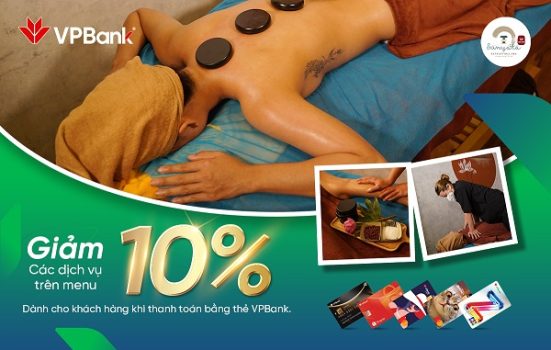 Giảm 10% (chưa bao gồm 2% phí charge thẻ) các dịch vụ trên menu dành cho khách hàng khi thanh toán bằng thẻ VPBank.
