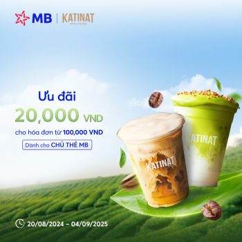 Từ 20/08/2024 đến ngày 04/09/2025, Ngân hàng TMCP Quân Đội (MB) hợp tác cùng Đối tác KATINAT mang đến chương trình “Ưu đãi 20,000 VND cho hóa đơn từ 100,000 VND dành cho chủ thẻ MB”.