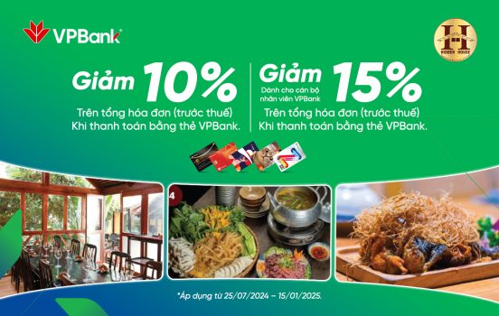 Chương trình hợp tác ưu đãi cho chủ thẻ VPBank tại Hidden House, giảm đến 15% khi chi tiêu và thanh toán bằng thẻ VPBank tại Hidden House, áp dụng từ ngày 25/07/2024 đến hết ngày 15/01/2025